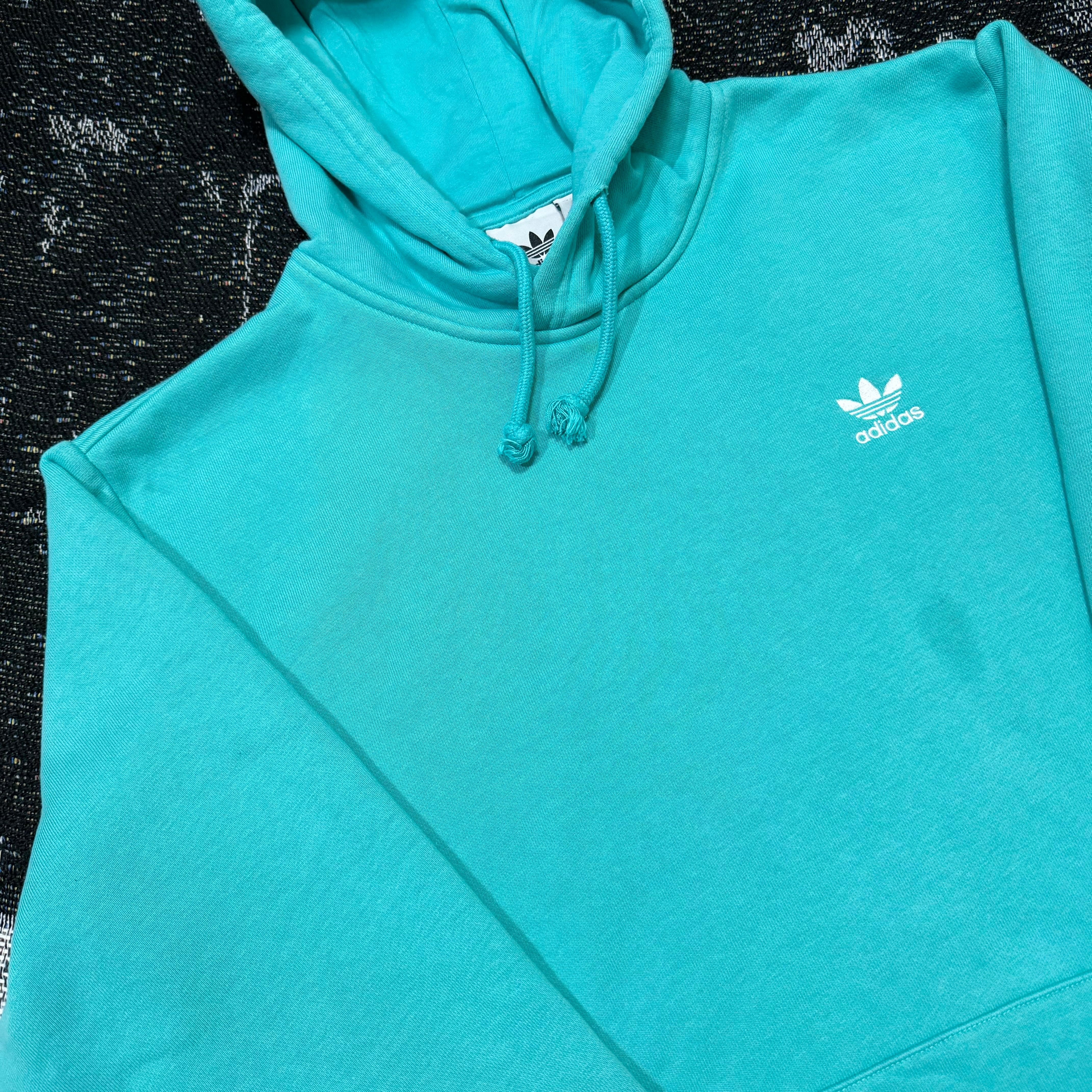 明るいボディに白のトレフォイルロゴが印象的なアディダスフーディー。